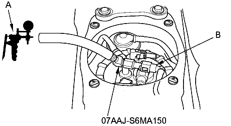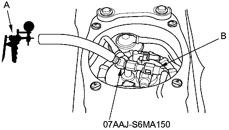 6. Attach the fuel pressure gauge attachment. Then connect a vacuum pump/gauge (A) to the suction line (B), and apply vacuum to the line.