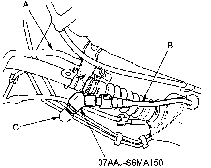 9. Disconnect the breather line (A). Attach the fuel pressure gauge attachment, then plug the suction line (B) with a rubber cap (C).