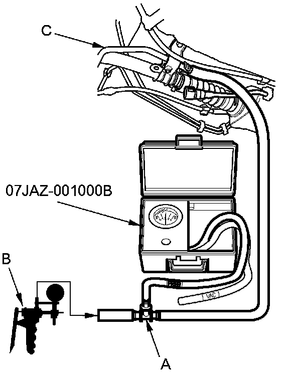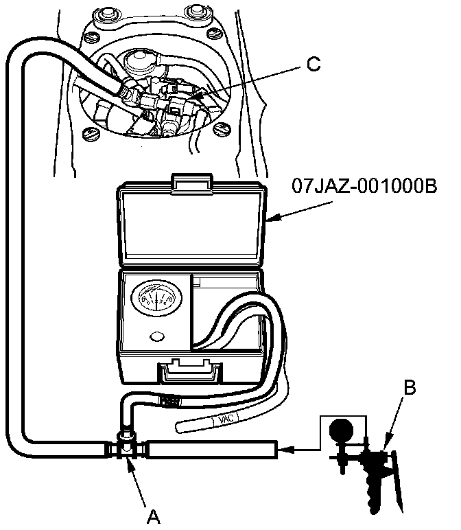 14. Attach the fuel pressure gauge attachment. Then connect a T-fitting (A) from the vacuum pump/gauge (B) to the suction line (C) as shown. Then apply pressure to the line.