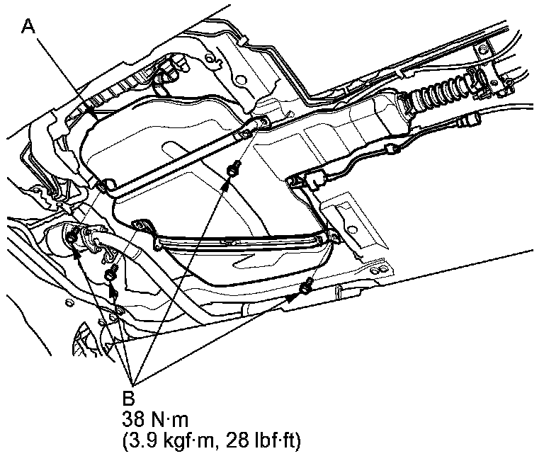 8. Remove the front floor cross beam (A), and the tank mount bracket (B).