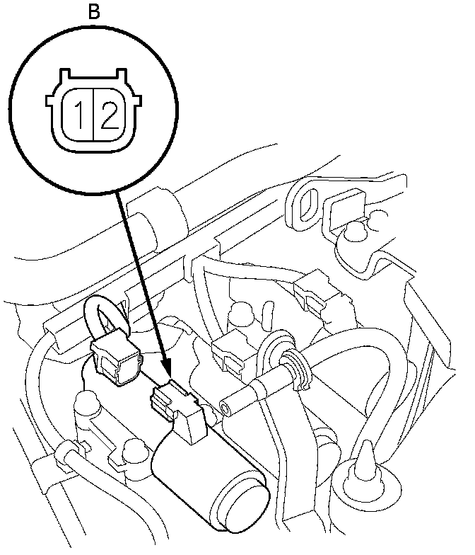 7. Connect a jumper wire from the negative battery terminal to the solenoid valve B connector terminal No. 2, and connect another jumper wire from the positive battery terminal to the connector terminal No. 1.