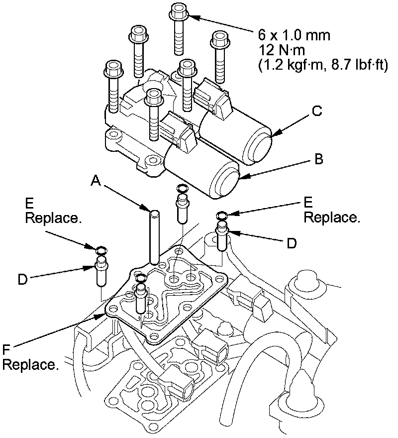 10. Remove the ATF pipe (A), the ATF joint pipes (D), the O-rings (E), and the gasket (F).