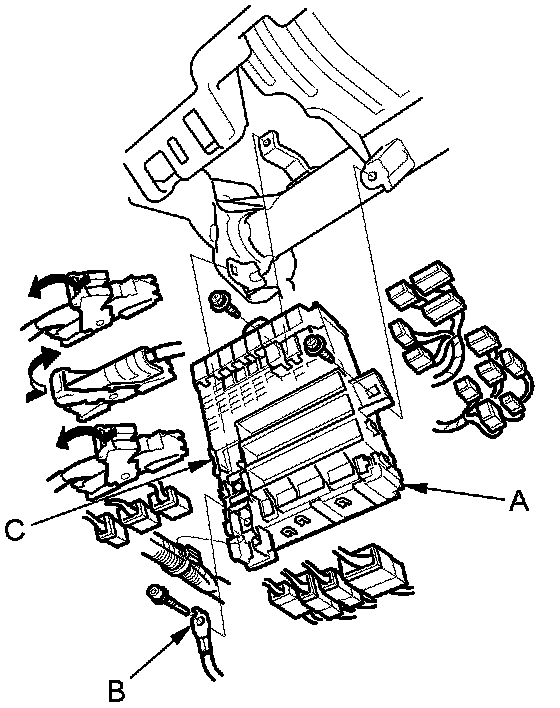 6. Release the lock (C) and pull the fuse/relay box away from the body.