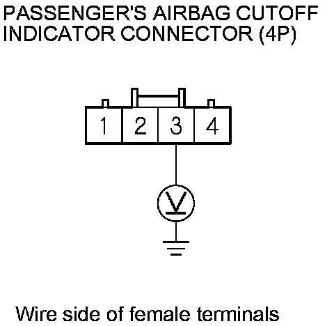 3. Measure the voltage between passenger's airbag cutoff indicator 4P connector terminal No. 3 and body ground. There should be battery voltage.