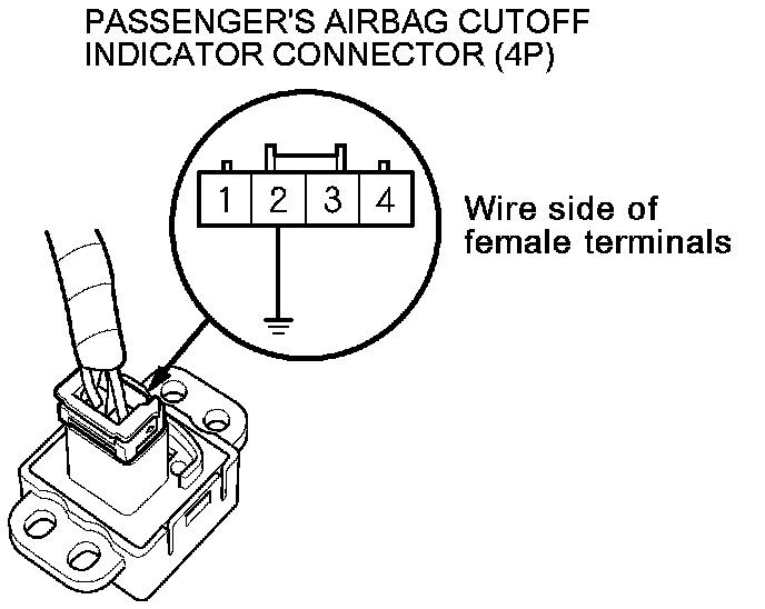 5. Install a jumper wire between passenger's airbag cutoff indicator connector (4P) terminal No. 2 and body ground. The indicator should come on.