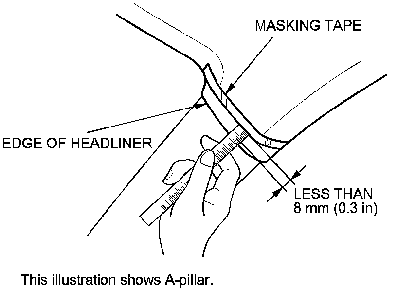 To prevent the side curtain airbag from deploying and damaging the pillar trim, the overlap between the headliner and pillar trim must be less then 8 mm (0.3 in). To check the overlap, do this: