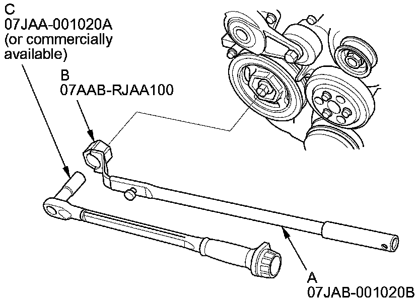 Crankshaft PulleyHold the pulley with the handle (A) and crankshaft pulley holder (B), then tighten the bolt to 37 Nm (3.8 kg-m, 27 lb-ft) with a torque wrench and a 19 mm socket (C). If the pulley bolt or crankshaft are new, tighten the bolt to 177 Nm (18.0 kg-m, 130 lb-ft), then remove the bolt and tighten it to 37 Nm (3.8 kg-m, 27 lb-ft).