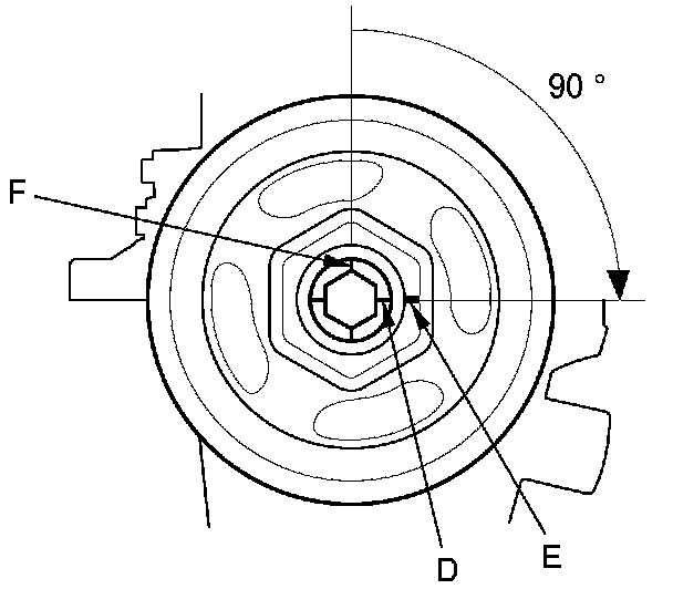 Mark the embossed mark (D) on the bolt flange and the crankshaft pulley (E) as shown, then tighten the bolt an additional 90 ° (The mark on the bolt head should line up with the next embossed mark (F) on the bolt flange).