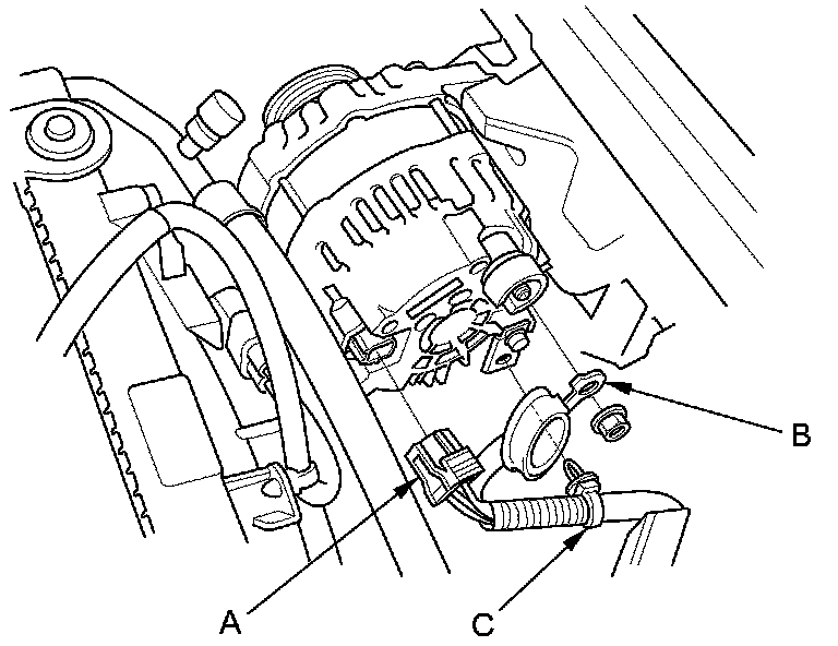4. Disconnect the alternator connector (A) and BLK wire (B), then remove the harness clamp (C) from the alternator.