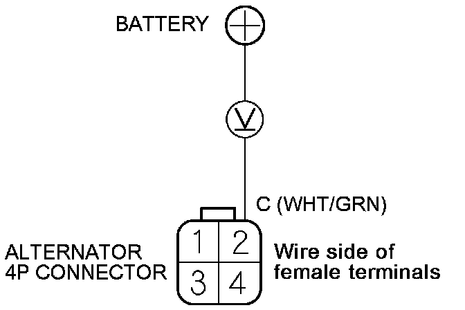 7. Measure the voltage between alternator 4P connector terminal No. 2 and the positive terminal of the battery.