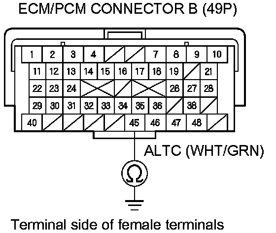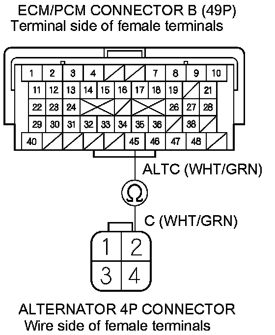 13. Check for continuity between ECM/PCM connector terminal B45 and alternator 4P connector terminal No. 2.