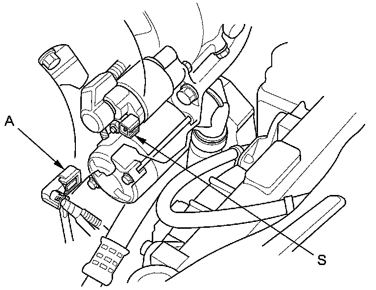 10. Make sure the shift lever is in N or P (A/T model) or neutral (M/T model), then disconnect the connector (A) from the starter S terminal. Connect a jumper wire from the battery positive terminal to the starter subharness 1P connector.