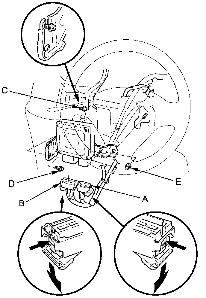 5. Remove the bolt (D) and nut (E) from the EPS control unit bracket.