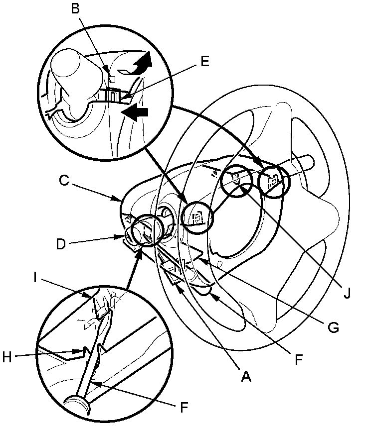 4. Release the hook (I) on the left side of the upper column cover. The right side hook (J) of the upper column cover can't be released from the inside.