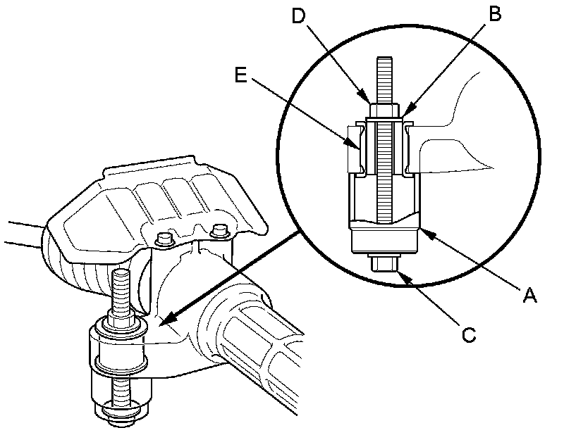 3. Hold the flange bolt with a wrench, and tighten the nut with a wrench. Remove the gearbox mount cushion (E).