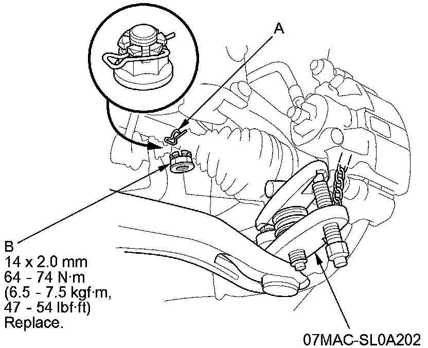 3. Remove the lock pin (A) from the lower arm ball joint, then remove the castle nut (B).