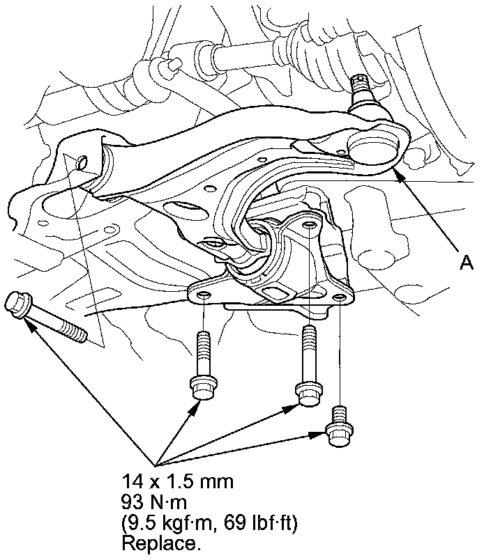 5. Remove the lower arm mounting bolts, then remove the lower arm (A) from the front subframe.