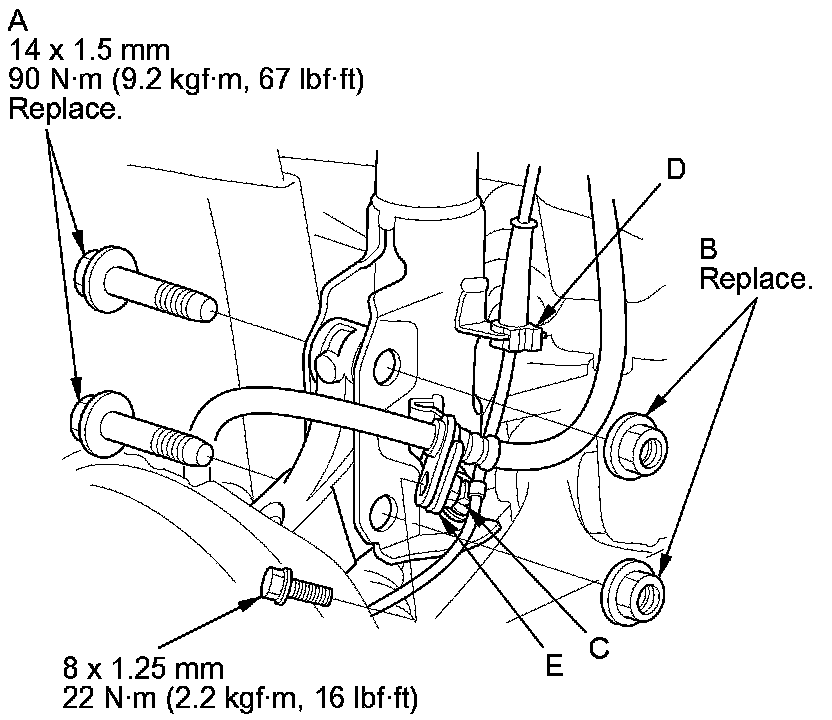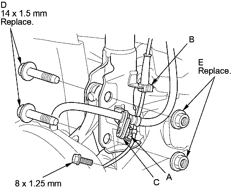 4. Install the wheel speed sensor harness clip (C), the wire guide grommet (D) and the brake hose bracket (E) to the damper.