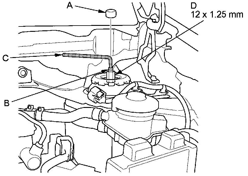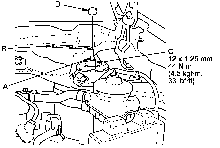 10. Hold the damper shaft (B) using a hex wrench (C), and loosen the damper mounting nut (D).