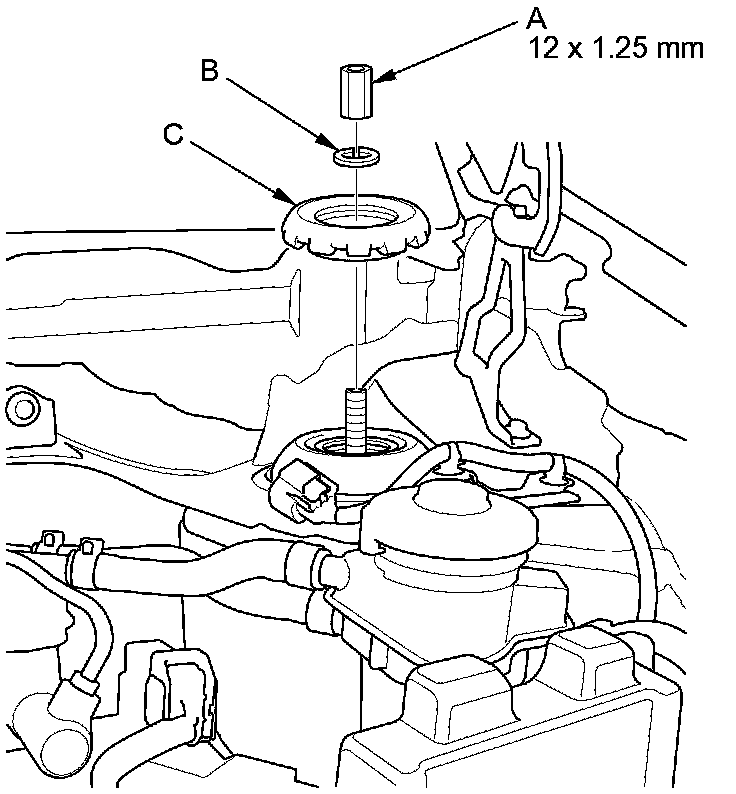 2. Install the damper mounting base (A) and the wave washer (B), then loosely install the damper mounting nut (C).