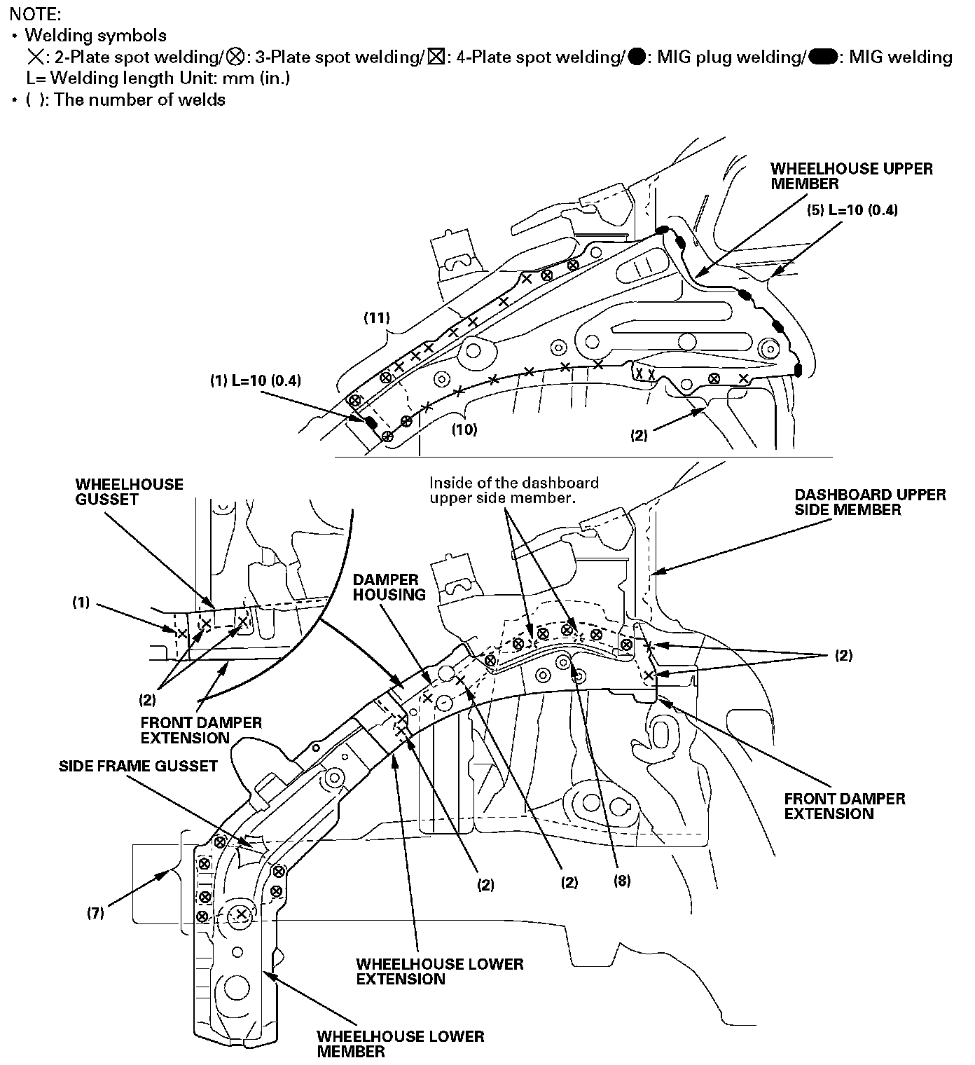 Mass production body welding positions and numbers (Wheelhouse upper member, lower member, and damper extension)