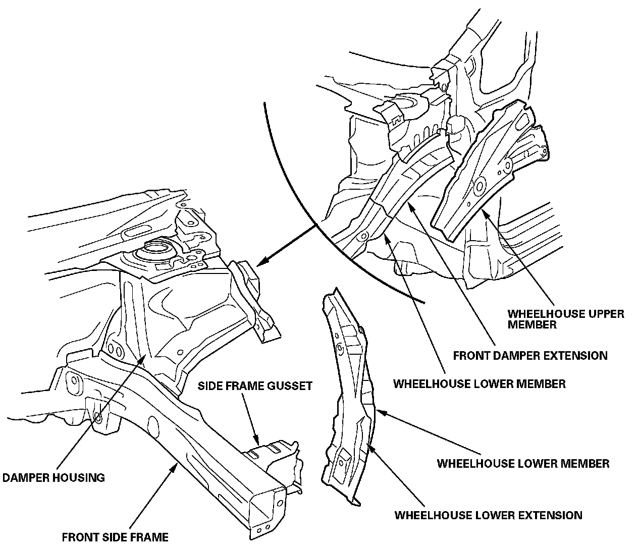 1. Clamp the new damper housing, the front damper extension, the side frame gusset, the gusset plate, the wheelhouse lower extension, and the bulkhead, and measure the front compartment diagonally.