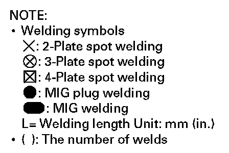 12. Weld the wheelhouse upper member (A).When reusing the wheelhouse upper member, weld it with MIG plug welding.