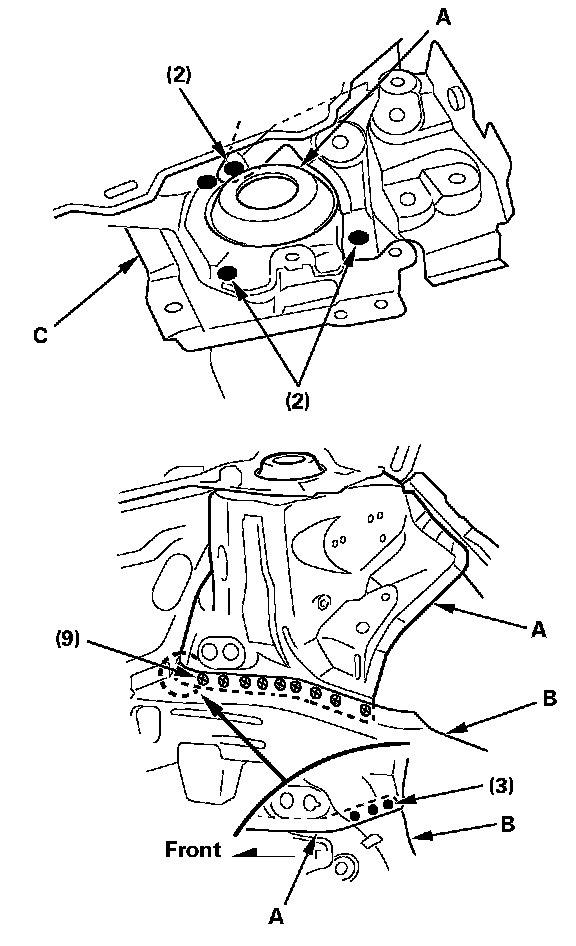 8. Drill the holes for welding the new front damper extension (A).Weld the damper housing (B), the front damper extension, and the dashboard upper side member (C).