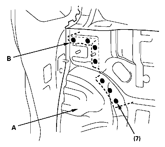 7. From the passenger's compartment side, plug weld the holes in the dashboard lower (A) and the damper housing (B).