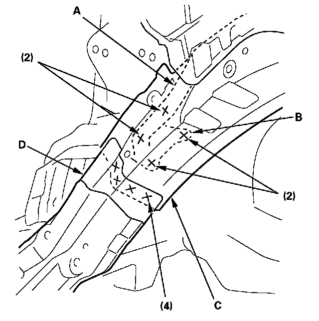 9. Weld the damper housing (A) and the wheelhouse gusset (B) to the front damper extension (C).Weld the front damper extension and the wheelhouse lower extension (D).
