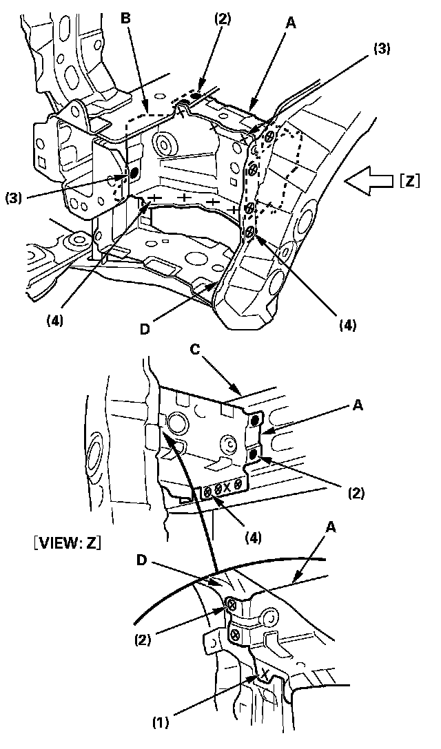 NOTE: When replacing the front damper extension, drill the position shown in DETAIL: X and DETAIL: Z from the outside of the dashboard upper side member, and drill the two spot welded points (A) at the joint for the front damper extension and the damper housing with a dia. 10 mm (0.4 in.) spot cutter.