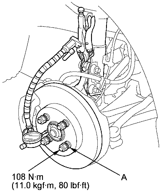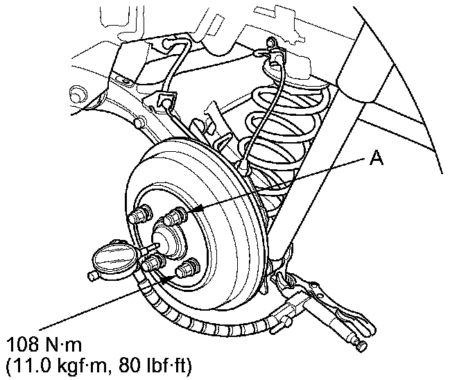 3. Install suitable flat washers (A) and the wheel nuts. Tighten the nuts to the specified torque to hold the brake disc securely against the hub.