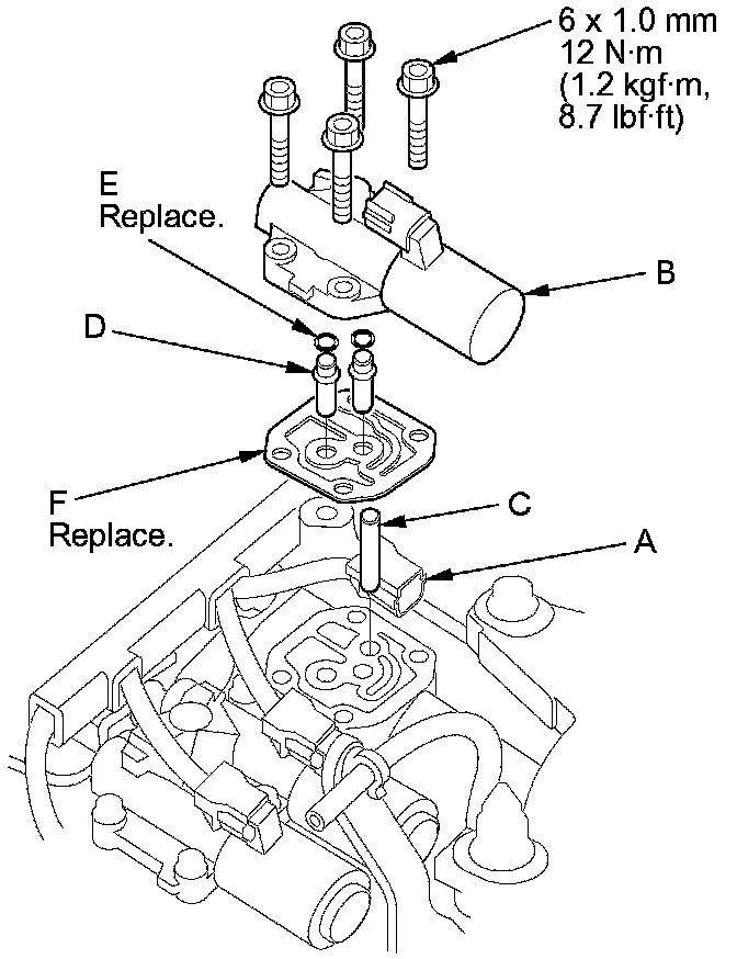 7. Remove the ATF pipe (C), the ATF joint pipes (D), the O-rings (E), and the gasket (F).