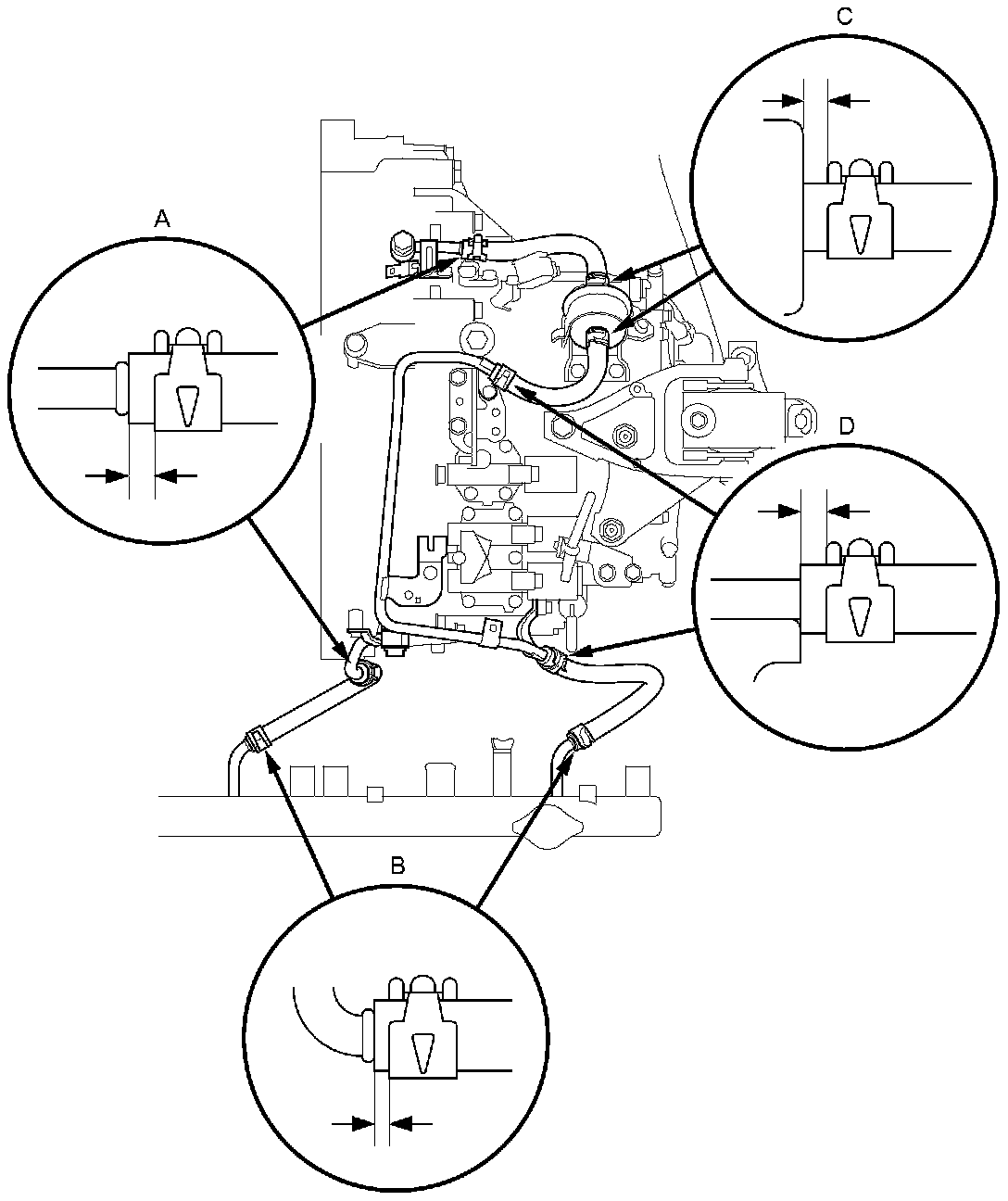 2. Install the ATF cooler hoses over the ATF cooler lines, and secure the hoses with the clips as shown in the details (A) (B) (C) (D), shown in the following figure. Keep the tabs of the clips clear of other parts.