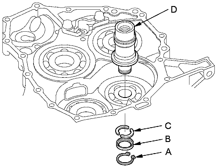 1. Remove the snap ring (A), the cotter retainer (B), and the cotters (C) from the idler gear shaft (D), then remove the idler gear shaft. Do not distort the snap ring.