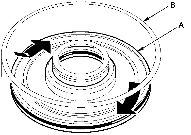 4. Install the clutch piston (A) in the clutch drum (B) while applying pressure and rotating to ensure proper seating. Do not pinch the O-ring.