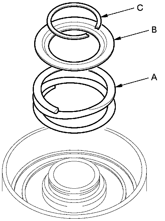 5. Install the return spring (A) and the spring retainer (B), and position the snap ring (C) on the spring retainer.