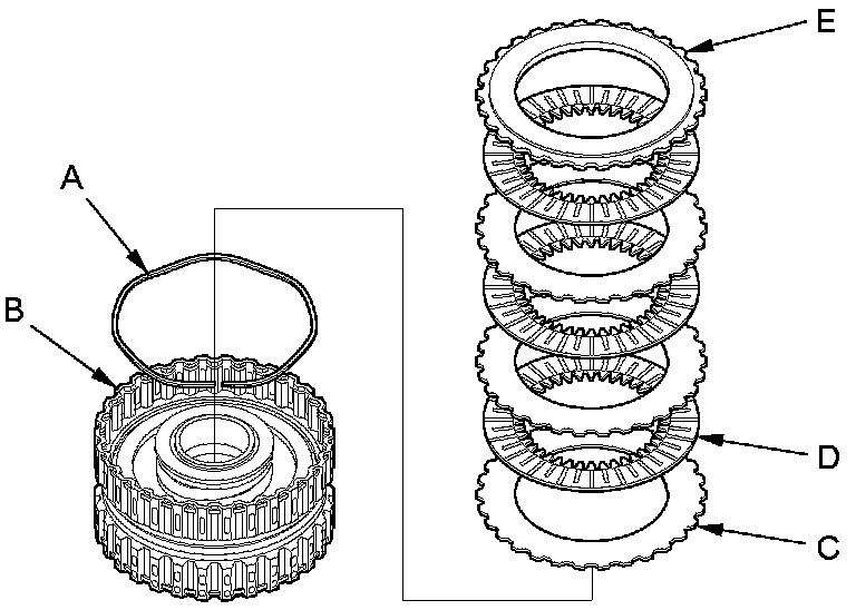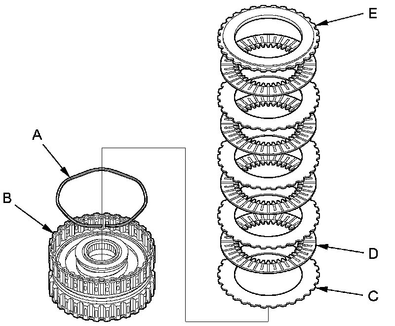 14. Install the wave spring (A) in the 3rd clutch drum (B). Starting with the clutch wave-plate, alternately install the wave-plates (C) (3) and the discs (D) (3). Install the clutch end-plate (E) with the flat side down on the top disc.