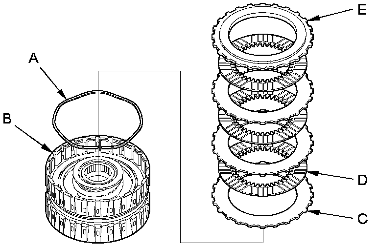 13. Install the wave spring (A) in the 4th clutch drum (B). Starting with the clutch flat-plate, alternately install the flat-plates (C) (4) and the discs (D) (4). Install the clutch end-plate (E) with the flat side down on the top disc.
