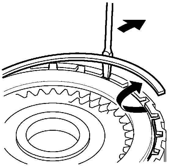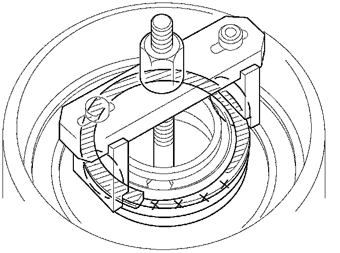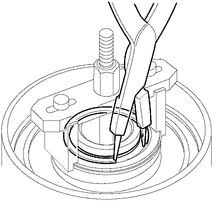 9. If either end of the clutch spring compressor attachment is not set over the clutch return spring end, the spring retainer may be tilted and damaged. If the retainer is tilted when compressing the return spring, reset the clutch spring compressor attachment on the retainer at another range.