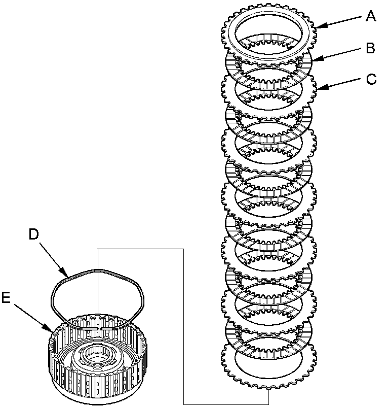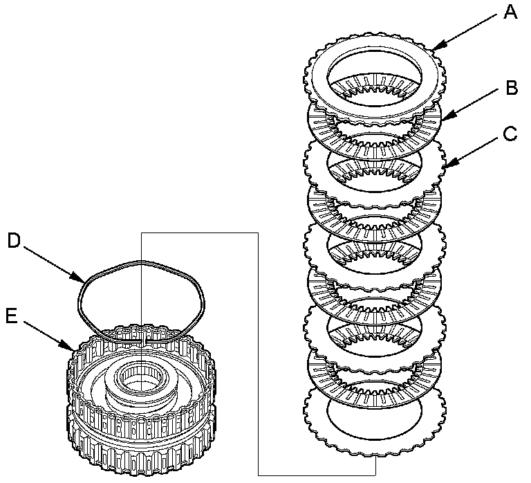 2. Remove the clutch end-plate (A), the clutch discs (B) (6), the clutch wave-plates (C) (6), and the wave spring (D) from the 1st clutch drum (E).