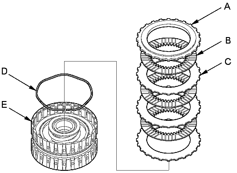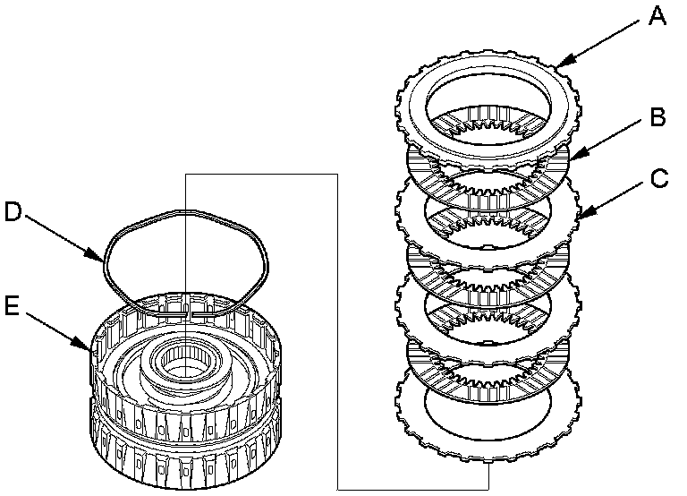 4. Remove the clutch end-plate (A), the clutch discs (B) (4), the clutch flat-plates (C) (4), and the wave spring (D) from the 4th clutch drum (E).