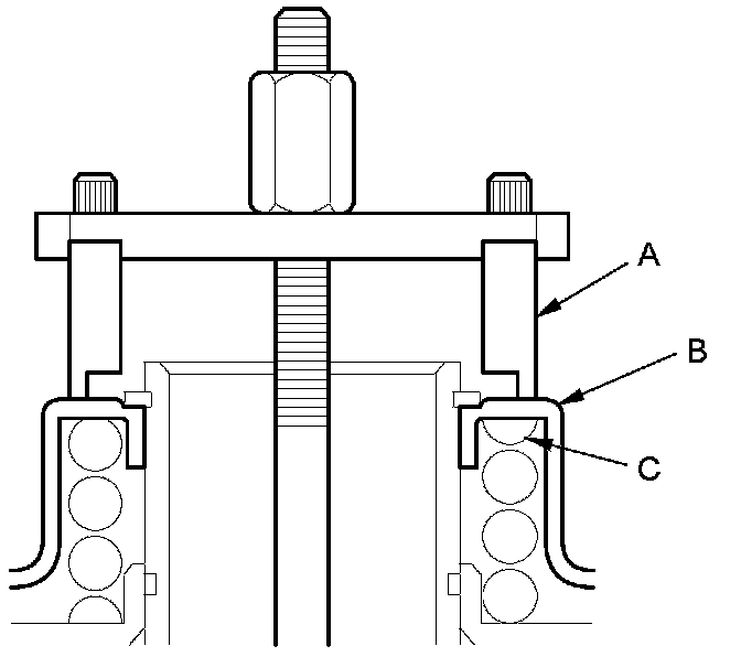8. Set the clutch spring compressor attachment (A) on the 1st clutch spring retainer (B) so the clutch spring compressor attachment works on the clutch return spring (C).