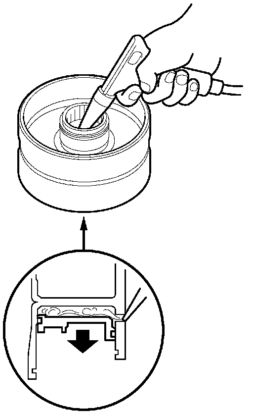 16. Wrap a shop rag around the clutch drum, and apply air pressure to the fluid passage to remove the piston. Place a finger tip on the other passage while applying air pressure.
