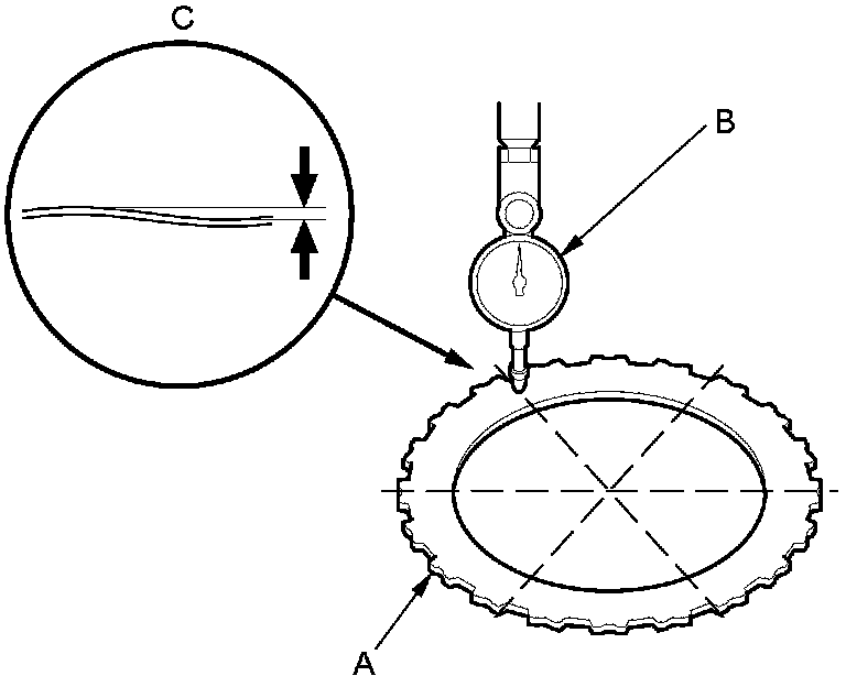 1. Place the clutch wave-plate (A) on a surface plate, and set a dial indicator (B) on the wave-plate.