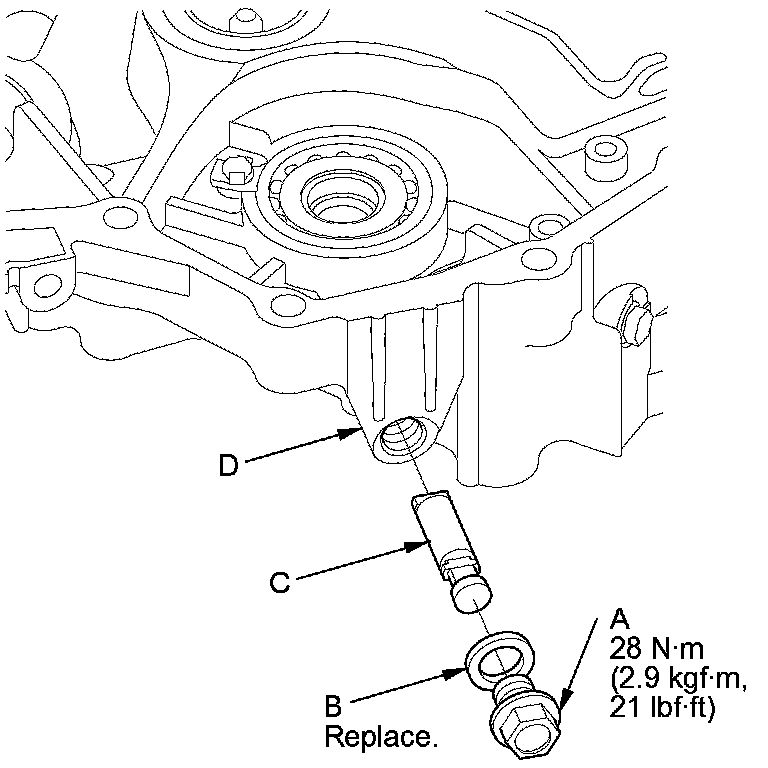 2. Remove the lubrication check valve (C) from the torque converter housing (D).