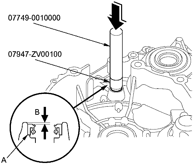 2. Install the new oil seal (A) in the torque converter housing to a depth (B) of 0.5-1.5 mm (0.02-0.06 in) below the housing surface using the driver handle and the oil seal driver attachment.