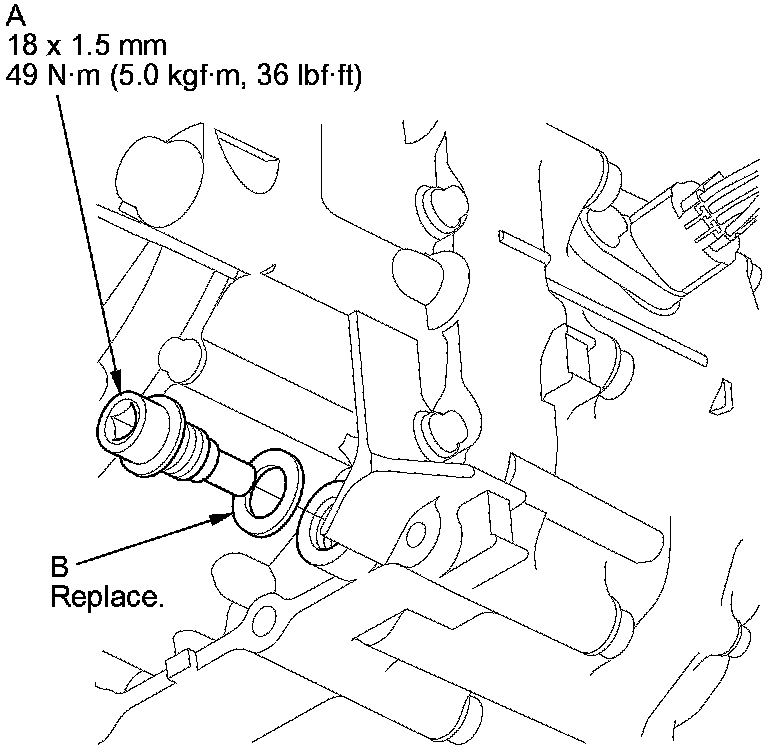 5. Reinstall the drain plug with a new sealing washer (B).