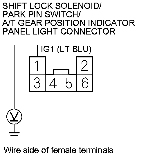 10. Measure the voltage between shift lock solenoid/park pin switch/A/T gear position indicator panel light connector terminal No. 1 and body ground.