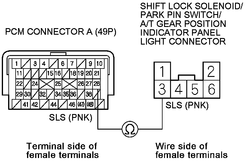 NOTE: Do not connect the positive battery terminal to the connector terminal No. 3 or you will damage the diode inside the shift lock solenoid.
